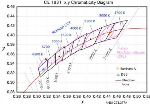 ANSI(美國國家標準組織)C78-377A 號文件使用四步MacAdam橢圓定義的方法作為CFL(小型熒光燈)和鹵素燈制造的標準。每一步代表了一片面積,該面積區(qū)域里的任何一個點都是離中心點一個標準差。
